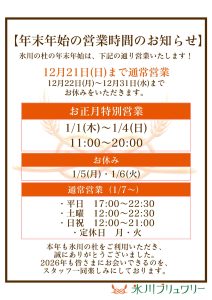 12月22日(月)〜12月31日(水) … 年末のお休みをいただきます